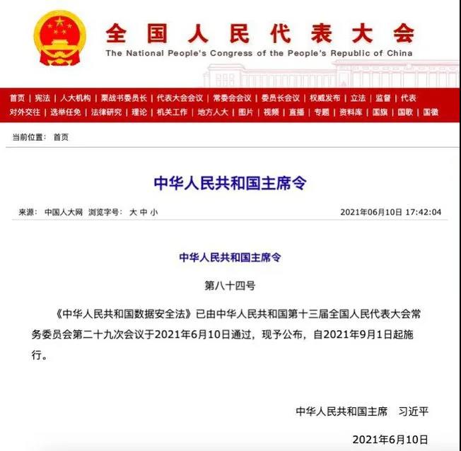 《中華人民共和國數據安全法》將自2021年9月1日起施行。生效之后,《數據安全法》將與《網絡安全法》及正在立法進程中的《個人信息保護法》一起,全面構筑中國信息及數據安全領域的法律框架。